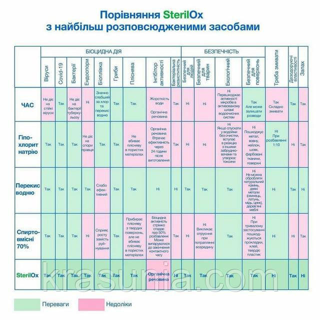 SterilOx —нова формула розчину для дезінфекції на основі хлорнуватистої кислоти (HOCl). Ефективне діє проти вірусів: сімей Adenoviridae, Parvoviridae, Coronaviridae, Paramyxoviridae, Herpesviridae. Миттєво ліквідує всі грампозитивні бактерії: Streptococcus spp., Staphylococcus spp., Clostridium spp., Enterococcus spp.) Знищує вплив грамнегативних бактерій: Escherichia coli, Salmonella spp ., Pasteurella spp., Bordatella spp., Leptospira spp.), нейтралізує мікоплазми (Mycoplasma spp.) і хламідії (Chlamydia spp.)