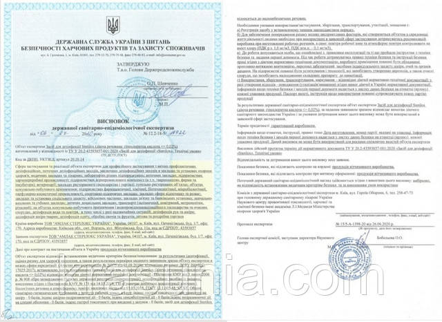 На розчин є в наявності всі сертифікати якості, що підтверджують ефективність та безпеку SterilOx.