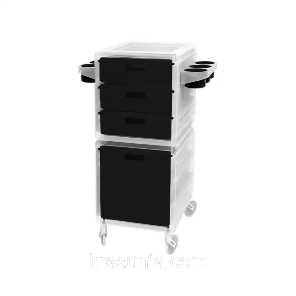 Візок має 6 висувних лотків, дві бічні панелі з утримувачами для фена і чаш, які можна кріпити на різній висоті і з різних боків.