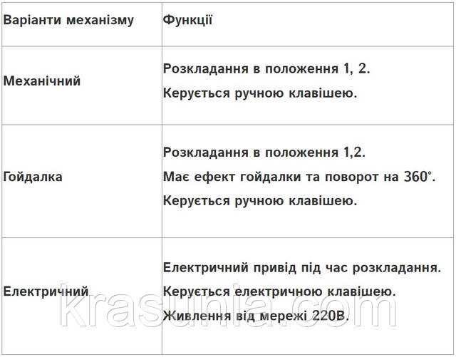 - Функція "Гойдалка" з доплатою. Відкидний механізм з ефектом хитання дозволяє хитатися в кріслі у складеному стані.
